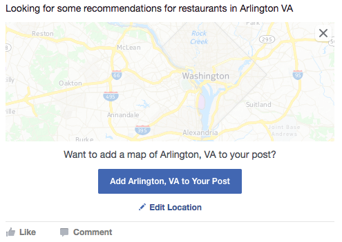 When you go to create a new post, all you have to do is phrase it as a clear request for suggestions — or better yet, include the word “recommendation(s)” in your post and Facebook will automatically label it as a request. If you add a city name in your request, after you post your request, Facebook will give you the option of adding a map.